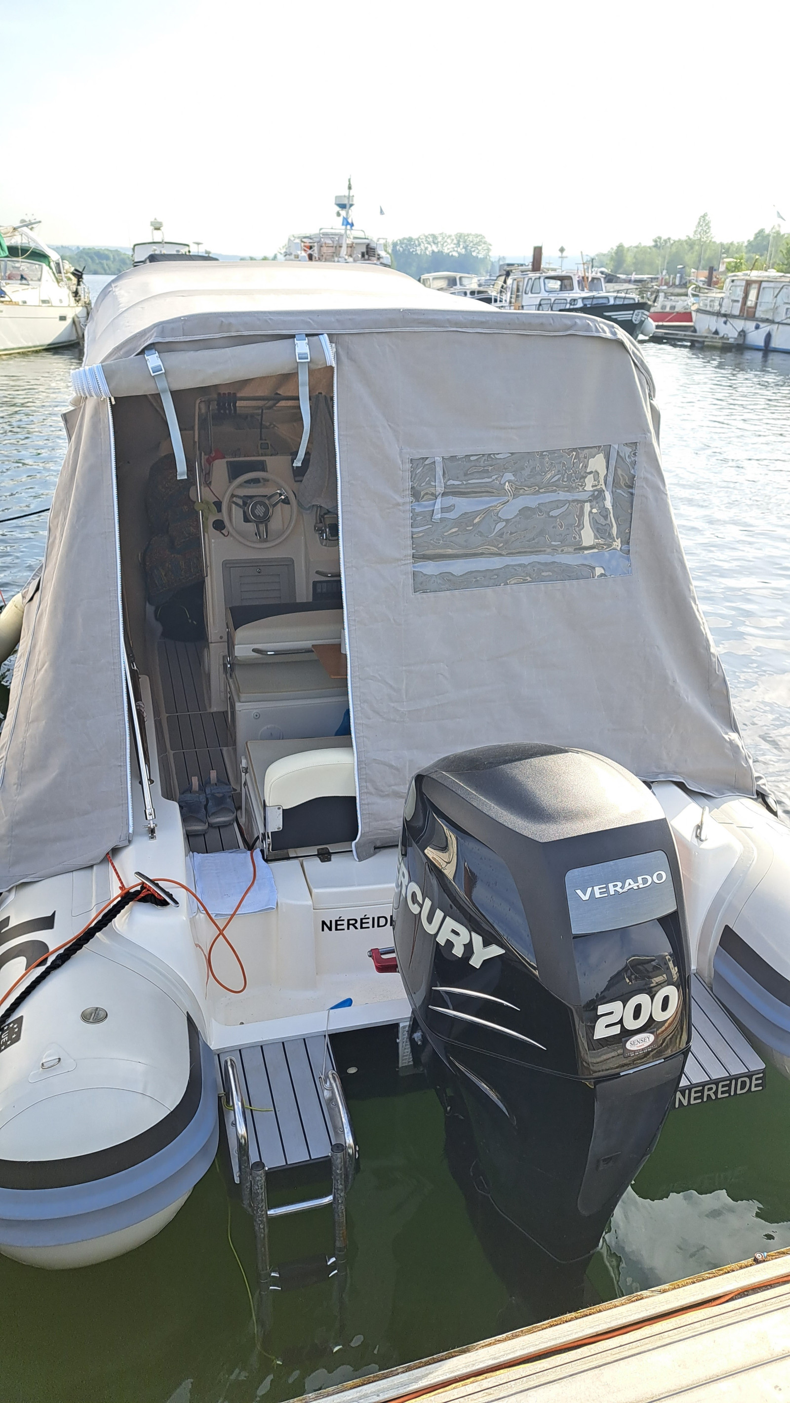 Moteur mercury verado 200cv commande électrique, direction hydraulique smartcraft, hélice inox équipé d'un écrou antivol sur tableau arriere et sur hélice, moteur ayant 945 heures toujours entretenu chaque année par professionnel factures a l'appui.