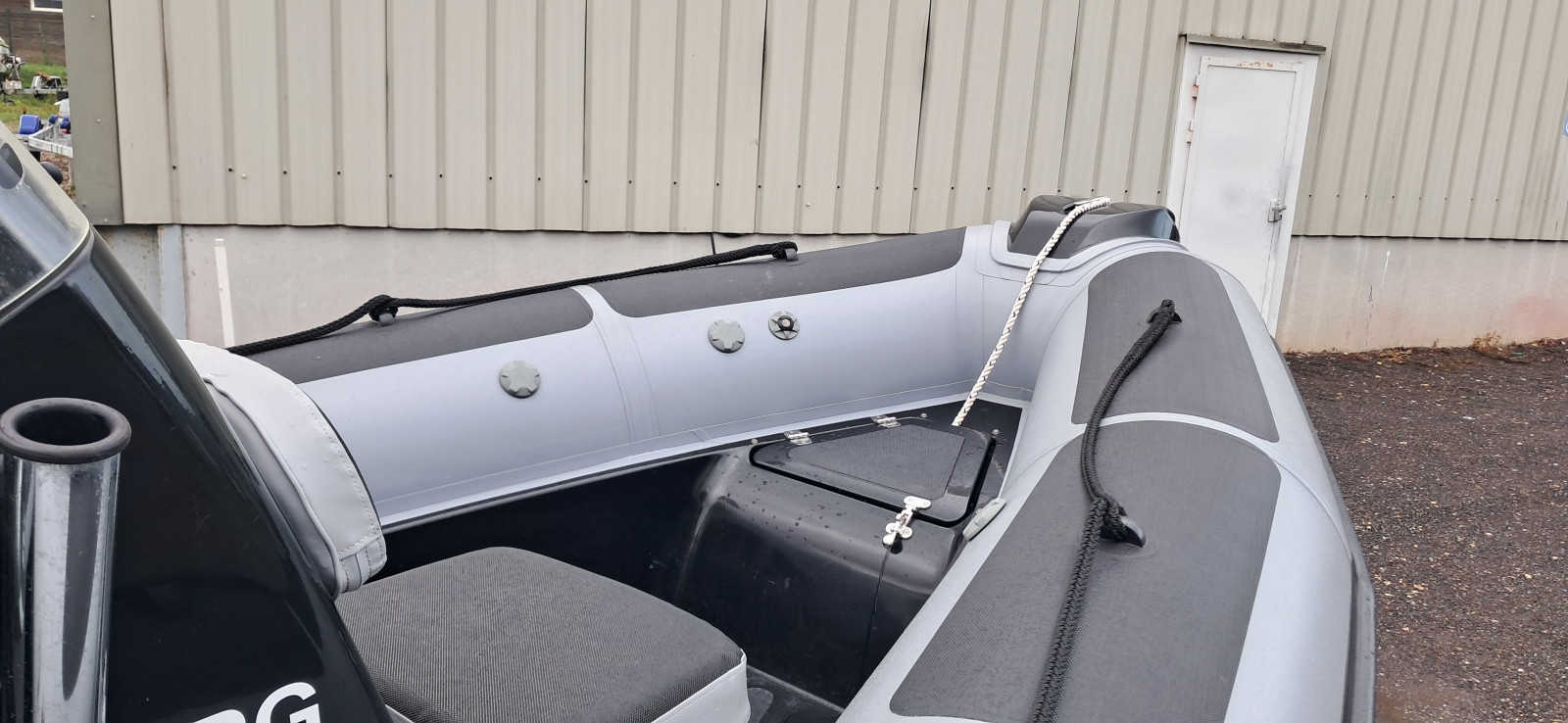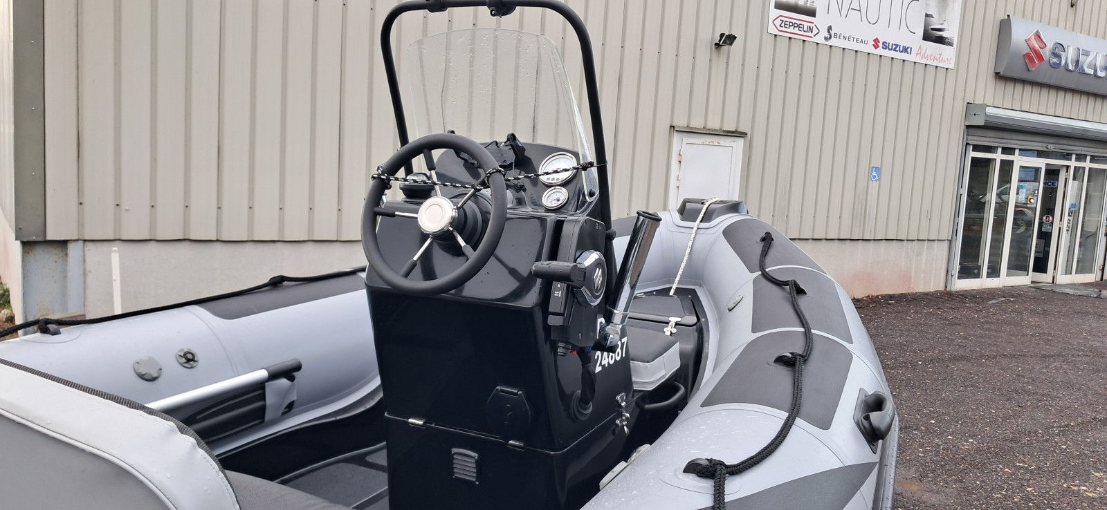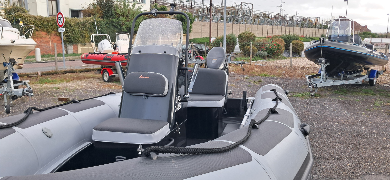 Bateau équipé d'une console avec assise avant et coffre de rangement, d'une banquette arriere 2 places avec coffre de rangement d'un davier polyester, d'un coffre baille a mouillage avec coussin d'assise et d'une protection d'étrave pour sécuriser les mises a l'eau.